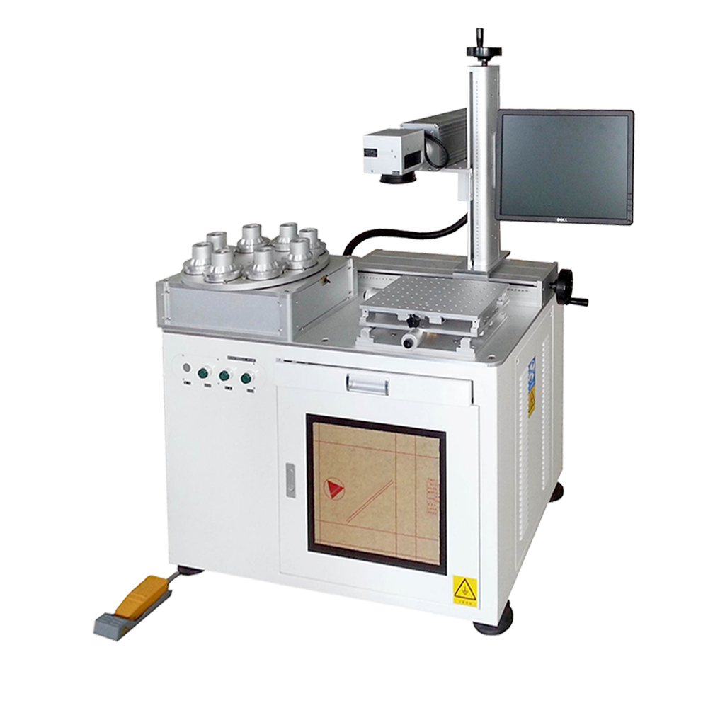 LED激光打標機采用八工位(視產(chǎn)品具體情況可設計為6工位或4工位)3D立體旋轉(zhuǎn)轉(zhuǎn)盤設計,光路X、Z軸手動移動可調(diào),單個工位之間獨立工作,自動360°旋轉(zhuǎn),減少上下料時間,提高工作效率。適用于產(chǎn)量在10K/d以上的球泡燈、要求打雙面、三面或360°旋轉(zhuǎn)打標的產(chǎn)品等,整臺機器的操作只需要普通人工進行手動上料一個簡易環(huán)節(jié),雙工作臺,平面打標,圓周打標一機兩用,操作簡單,速度快,效率高,標刻清晰,無損耗。