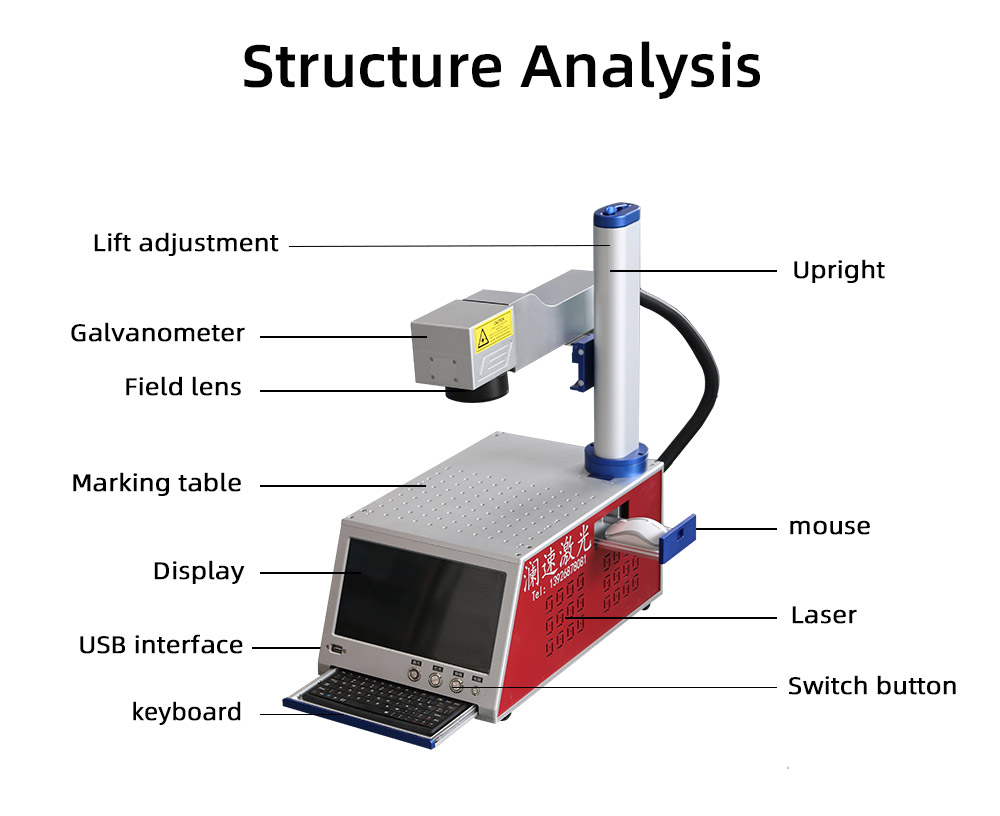 Small and flexible, the size of the whole machine and the computer main box, 30 kg of the whole machine, laser marking of large mechanical parts in any direction.